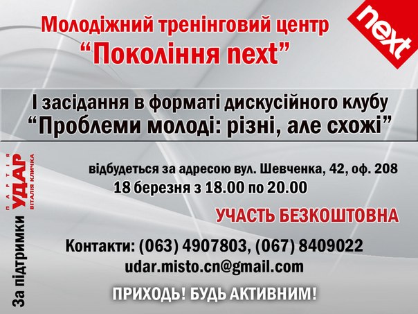 Первая встреча в формате дискуссионного клуба на тему «Проблемы молодежи — разные, но похожие» состоятся 18 марта в 18. 00 по адресу: ул. Шевченко, 42, оф. 208 (офис городской партийной организации ПП «УДАР»).
