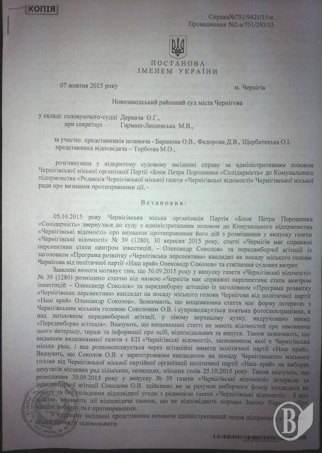 7 октября Новозаводской суд Чернигова отказал в иске Черниговской городской организации партии"Блок Петра Порошенко"Солидарность"к газете"Черниговские ведомости".