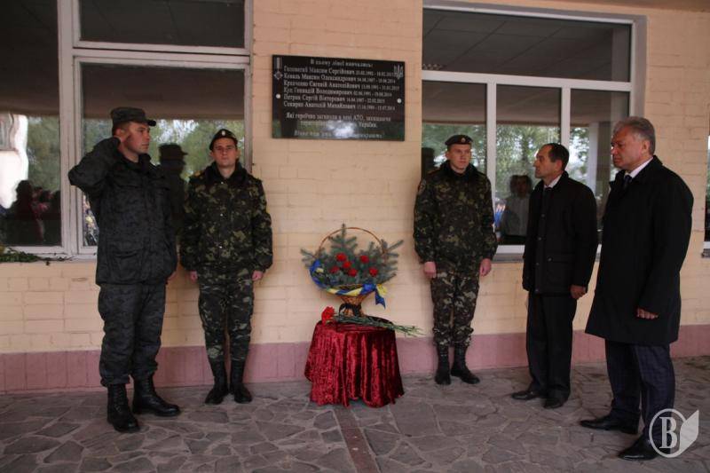 Меморіальну дошку на честь шістьох загиблих у зоні АТО випускників відкрили вчора, 13 жовтня, на будівлі Чернігівського професійного будівельного ліцею. Право відкрити дошку було надане учасникам бойових дій в Афганістані – чернігівському міському голові Олександру Соколову та директору навчального закладу Михайлу Гавриленку, а також учаснику АТО Миколі Слісарчуку.