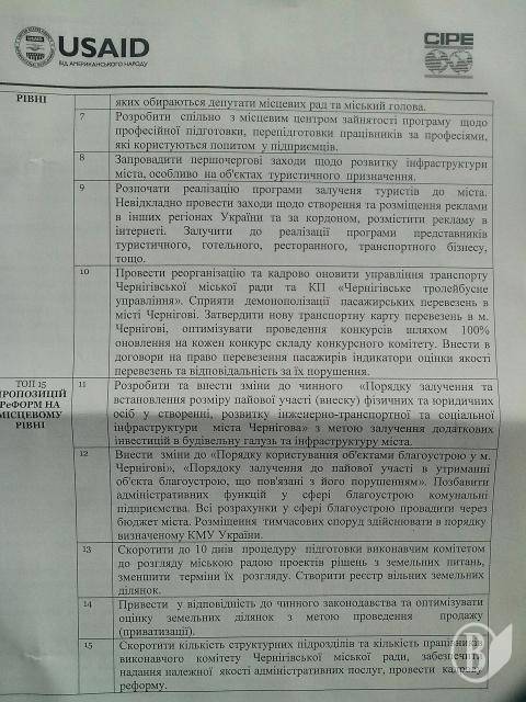 - Ставлячи свій підпис, ці кандидати не тільки продемонструють підтримку малому та середньому бізнесу, а й готовність реалізувати наші пропозиції щодо покращення бізнес-клімату в м. Чернігові, - підкреслює один з координаторів цього проекту, голова Центру підтримки малого та середнього бізнесу Ірина Березинець. - Ця зустріч проходить за ініціативою Коаліції малого та середнього бізнесу м. Чернігова та регіональних партнерів проекту USAID «Впевнений бізнес - заможна громада».