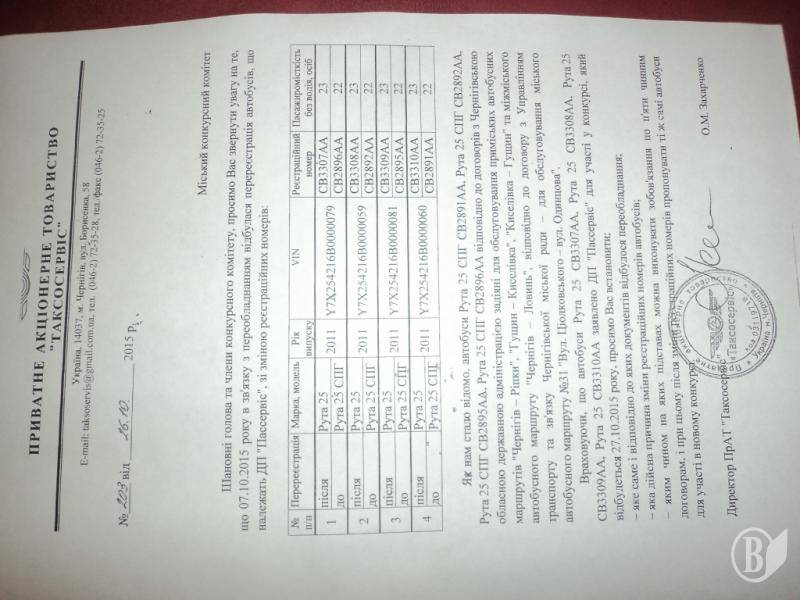 Окрім цього, за інформацією ПрАТ «Таксосервіс», 4 заявлені РУТи на конкурс відповідно до договорів з Чернігівською обласною державною адміністрацією задіяні для обслуговування приміських і міжміських автобусних маршрутів. Цей факт не помітили представники Управління транспорту і зв’язку чи не звернули увагу, чи тут є корупційна складова – питання залишається відкритим.