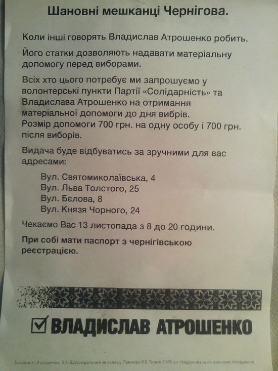 Проте, ніде не вказано, хто такий В. Атрошенко і чому він вирішив надавати допомогу саме зараз, перед другим туром виборів мера Чернігова. У листівці чимало помилок, але основна думка висловлена досить чітко: аби отримати гроші, слід прийти із паспортом за вказаними 4 адресами до волонтерських пунктів.