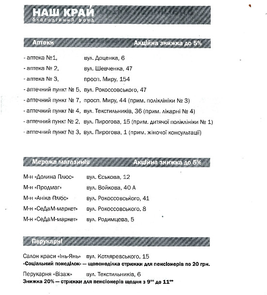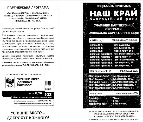 Шкода, що в Чернігові є такі нелюди, які з метою заплямування роботи благодійного фонду «Наш край» використовують довіру людей. Розповсюджують брехливі листівки з «казковими» обіцянками, - говорить директор-розпорядник благодійного фонду «Наш край» Олександр Любарець. - Підкреслюю, що в обласному центрі на постійній основі працює програма «Соціальна картка мешканця Чернігова», згідно якої її власникам надаються наступні знижки.