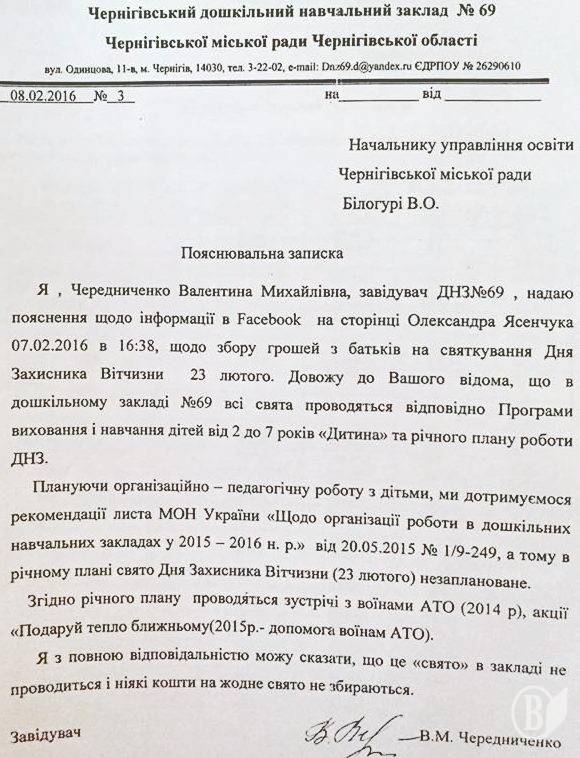 На проання відреагувати на це заступник міського голови Ольга Хонич надала пояснення завідуючої ДНЗ 69 Валентини Чередниченко (на доданому фото).