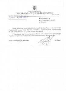Однако новость выдалась мне настолько фантастической, что я запросила ее письменного подтверждения. Вскоре поступило письмо, подготовленное старшим следователем Светланой Туренок, за подписью тогдашнего начальника городской милиции Владимира Рапуты: «На данное время уголовное производство находится на изучении в Генеральной прокуратуре Украины». Нет претензий. Как говорят в Чернигове – «чин-чинарем». ». И только впоследствии просветлело: начальника грубо «подставили» подчиненные.