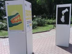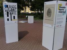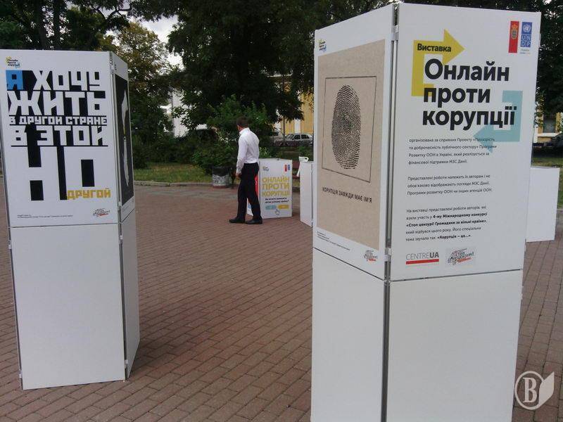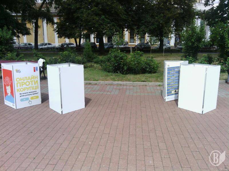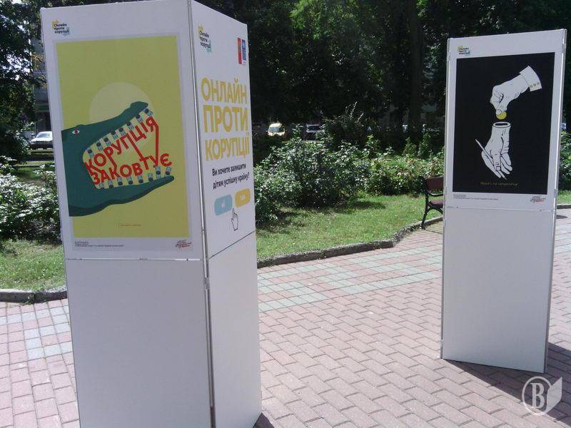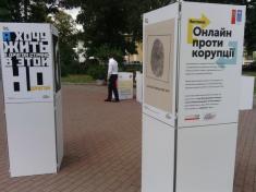 У сквері Попудренка зранку відкрито одноденну виставку антикорупційних плакатів «Онлайн проти корупції».