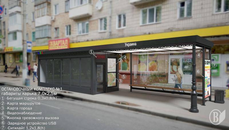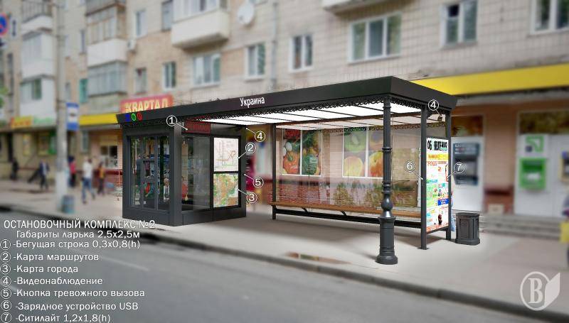 Усі зупинки будуть оснащені та наповненні однаково, різниця тільки в розмірах кіосків. Колір усіх комплексів – темно-сірий. На зупинках буде відведене місце для реклами: рухомий рядок розміром 0,3х0,8 м та «сітілайт» розміром 1,2х1,8 м. Також обов’язково там будуть присутні карта міста та карта маршрутів.