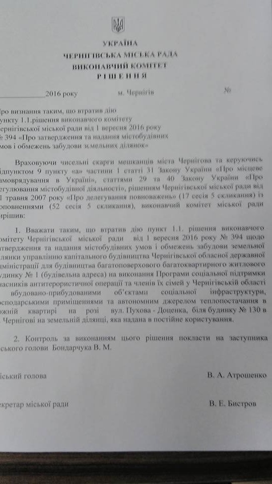 Виконком Чернігівської міськради сьогодні, 26 жовтня, скасував містобудівні умови та обмеження на будівництво одного із будинків поблизу Березового гаю, що на розі вулиць Пухова та Доценка.