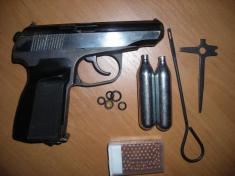 Предмет, схожий на пістолет, в напіврозібраному стані, з маркуванням на затворі «МР 654К». І магазин для газового балончика з вуглекислим газом та кульками калібру 4,5мм