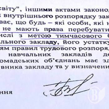 Своїм листом він забороняє перебування на території навчального закладу будь-кого, хто не є учасником навчально-виховного процесу цього закладу.