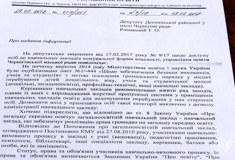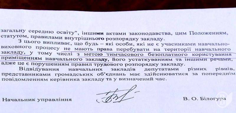 Своїм листом він забороняє перебування на території навчального закладу будь-кого, хто не є учасником навчально-виховного процесу цього закладу.