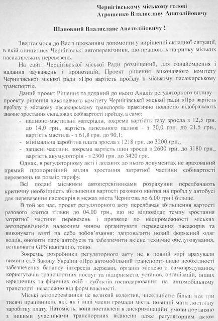 З метою попередити соціальну напругу і недопущення транспортного колапсу, чернігівські перевізники звернулися до Чернігівського міського голови Владислава Атрошенка з відкритим листом (на фото нижче).