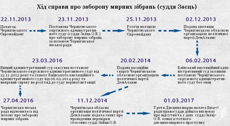 Саме суддя Заєць постановив заборонити мирні зібрання в центрі Чернігова, внаслідок чого 25 листопада 2013 року міліція та державні виконавці знесли Євромайдан.