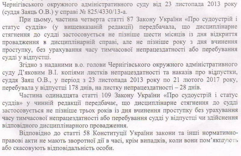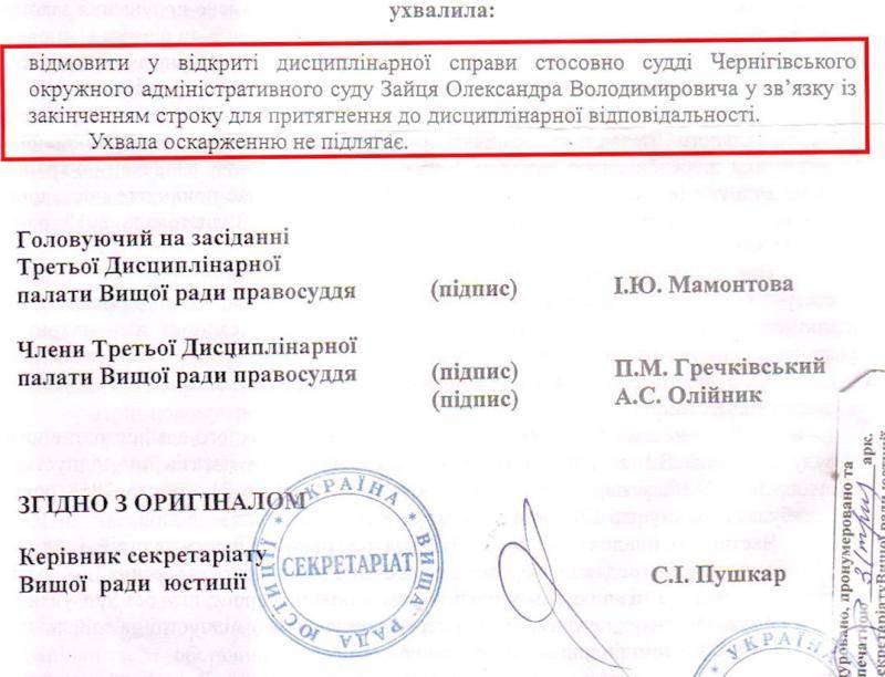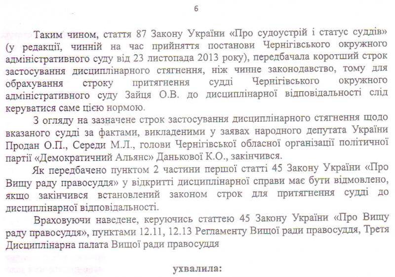 Дисциплінарне стягнення до судді може застосовуватись не пізніше 3-х років з дня вчинення проступку. Після того, як трирічний термін сплив, заяву розглянули. В тексті ухвали вказано, що не виявлено фактів, які б могли вказувати про грубу недбалість чи навмисне порушення закону суддею Зайцем.