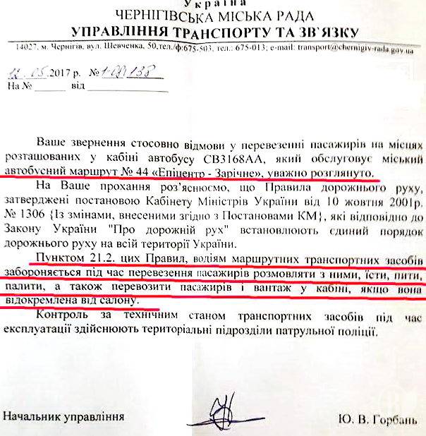 Не так давно чернігівець поцікавився в управління транспорту та зв’язку міської ради щодо наявності факту порушення, коли в маршрутних таксі водій закриває передні двері, тим самим не дозволяючи пасажирам сидіти біля нього.