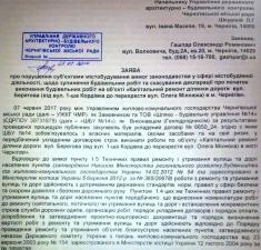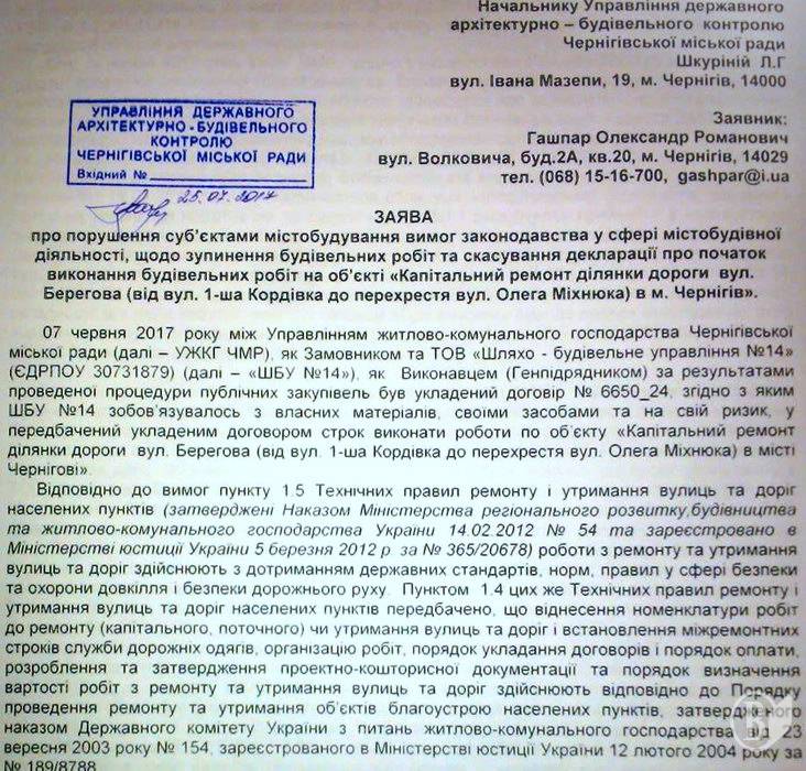 1. В Декларації про початок виконання будівельних робіт на об’єкті «Капітальний ремонт ділянки дороги вул. Берегова (від вул. 1-ша Кордівка до перехрестя вул. Олега Міхнюка) в м. Чернігів», котра була зареєстрована в червні Держархбудінспекцією, відповідальна посадова особа Управління ЖКГ міськради вказала завідомо недостовірні дані стосовно проектувальника, особи, що здійснює авторський нагляд та щодо підрядника.
