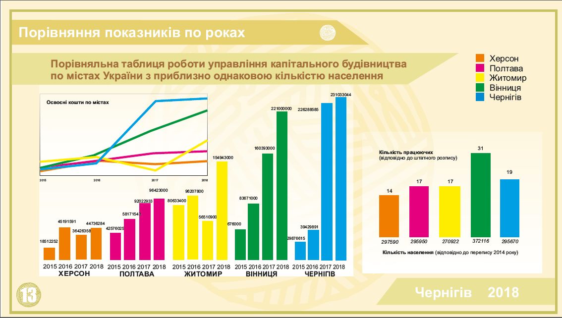 Якщо обсяг будівельних і ремонтно-будівельних робіт, виконаних у 2018 році на міських комунальних об’єктах Чернігова, порівняти з аналогічними обсягами в інших українських містах, подібних Чернігову за кількістю населення, то побачене сповнить гордістю за наше місто.