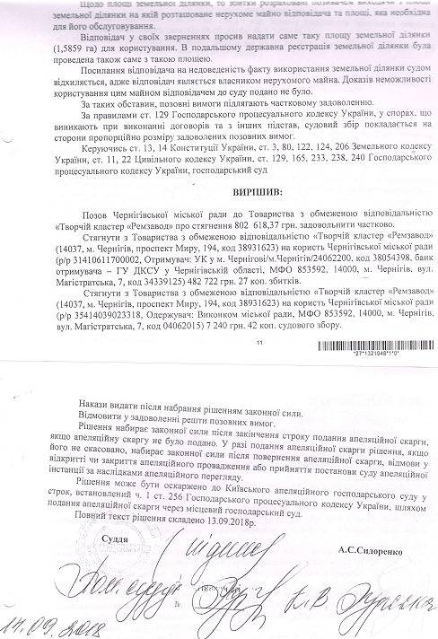 Судова справа №927/437/18 за Позивом Чернігівської міської ради до ТОВ «Творчій кластер «Ремзавод» - «Про стягнення 802 618 грн. 37 коп. збитків (упущеної вигоди)….»