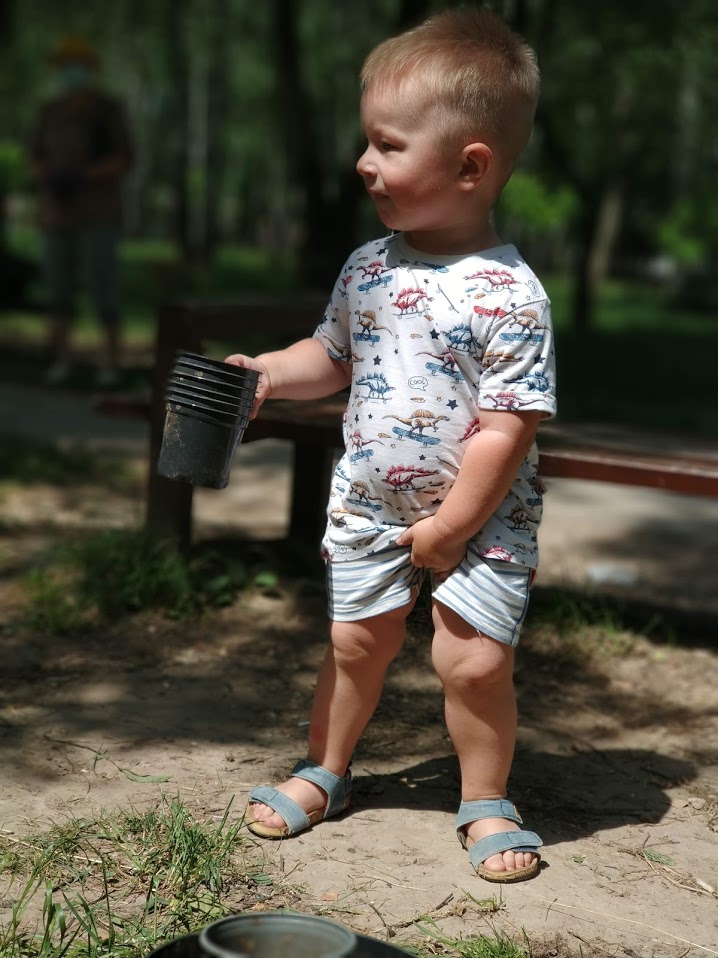 Найменшенькому Артемчику не виповнилося і двох рочків. Йому 1 рік і 8 місяців. Але дорослим з відеречками для розсади він допомагав садити чорнобривці справно.
