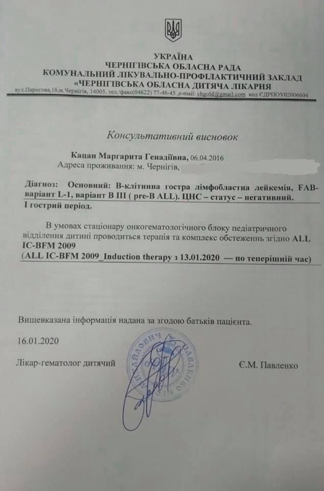 Зараз Маргаритка проходить перший курс хіміотерапії. Дівчинка потрапила у високу групу ризику. Наразі лікарі мають вирішити питання подальшого лікування в іншій клініці.