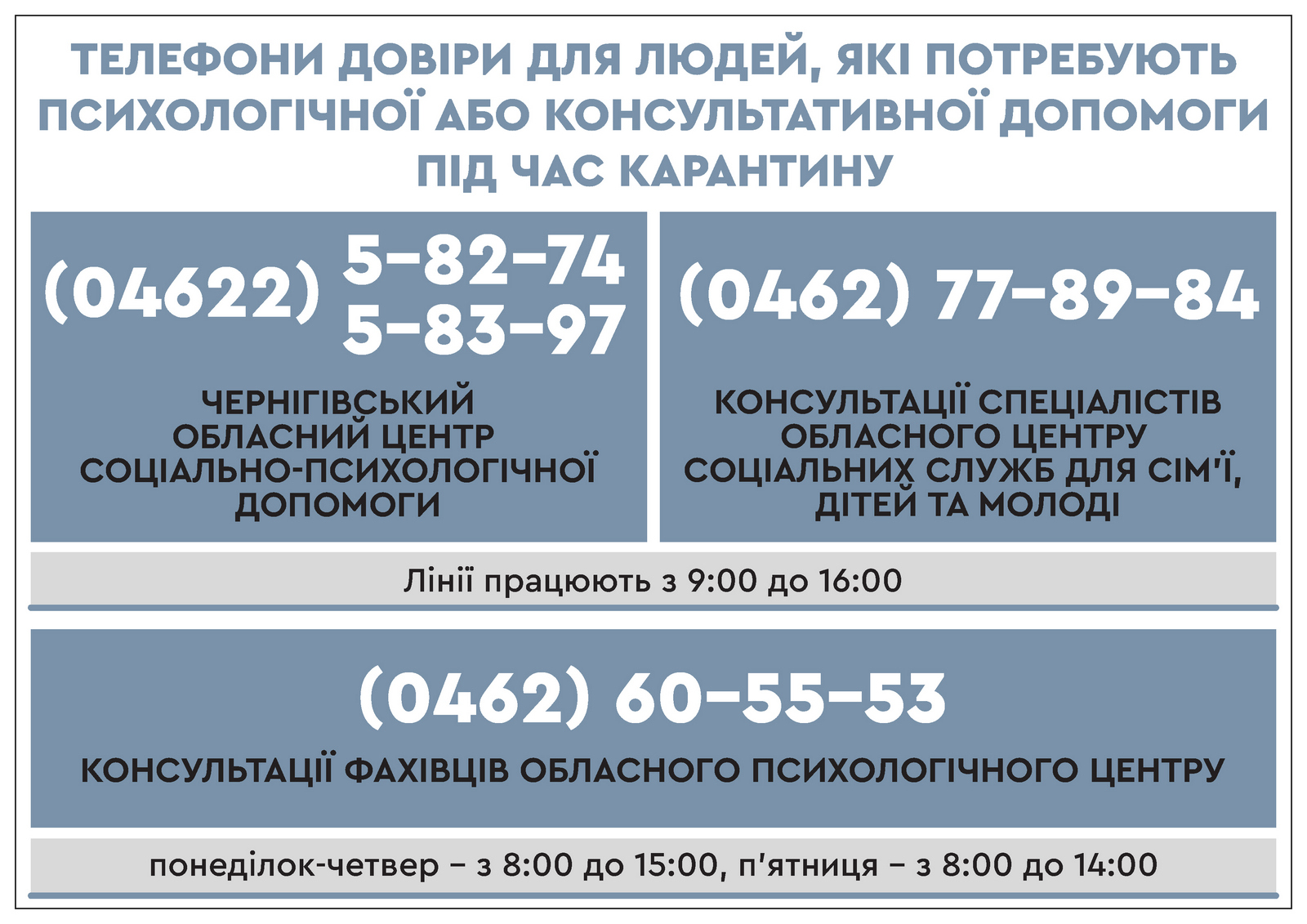 Шановні жителі області! Якщо ви потребуєте психологічної або консультативної допомоги під час карантину, запровадженого у зв’язку з поширенням коронавірусу, скористайтеся «телефонами довіри», що діють на Чернігівщині.