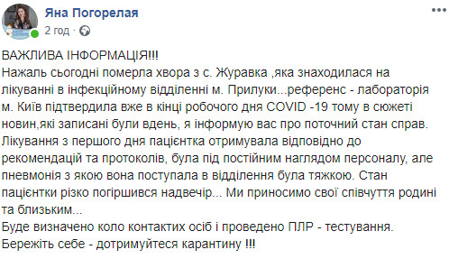 Вчора, 23 квітня, померла хвора з с. Журавка, яка знаходилася на лікуванні в інфекційному відділенні лікарні м. Прилуки. Про це на своїй сторінці у Facebook повідомляє головний лікар КНП «Прилуцька центральна міська лікарня» Яна Погоріла.