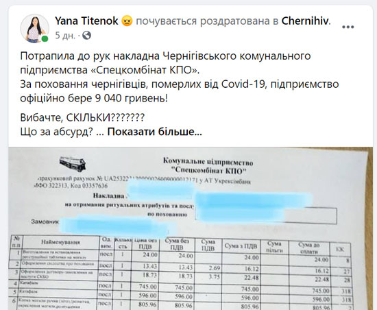 А 12 січня контактній особі Оксані Зарецькій, під тиском обставин – далі зрозумієте - було виписано рахунок на неповне поховання у сумі 2 146 грн.84 копійки. Куди входять обов’язкові платежі на виготовлення таблички з реєстраційного номера поховання, оформлення свідоцтва та договору на поховання, замовлення 1 катафалк (для перевезення на кладовище померлого від COVID-19), копання, засипання і формування могили взимку.