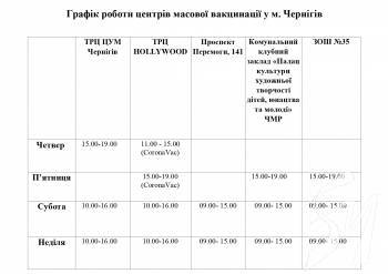 Графік роботи додаткових пунктів вакцинації у Чернігові