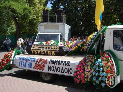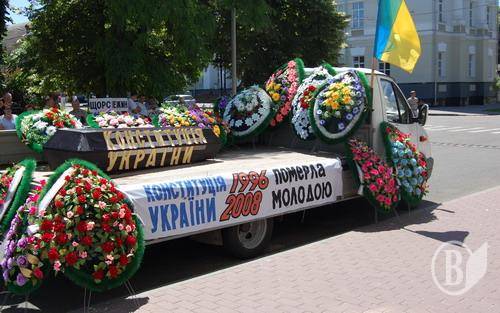 Учасники тримають таблички з назвами міст-райцентрів області. На автобусах закріплені гострословні плакати. Підготовлена труна Конституції і прикрашена вінками.