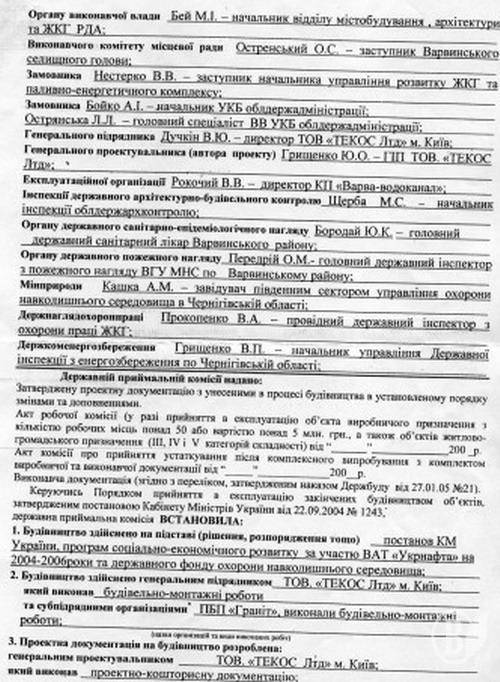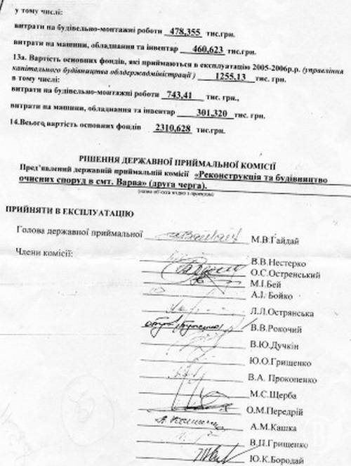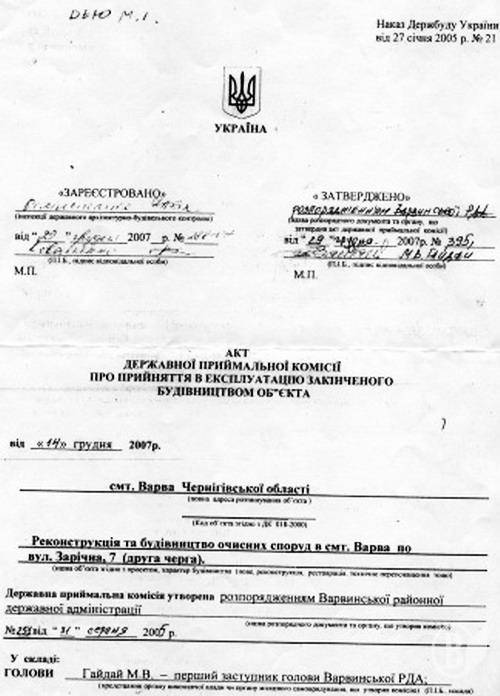 Акт про завершення будівництва очисних споруд у селищі Варва Чернігівської області – як речовий доказ корупції.