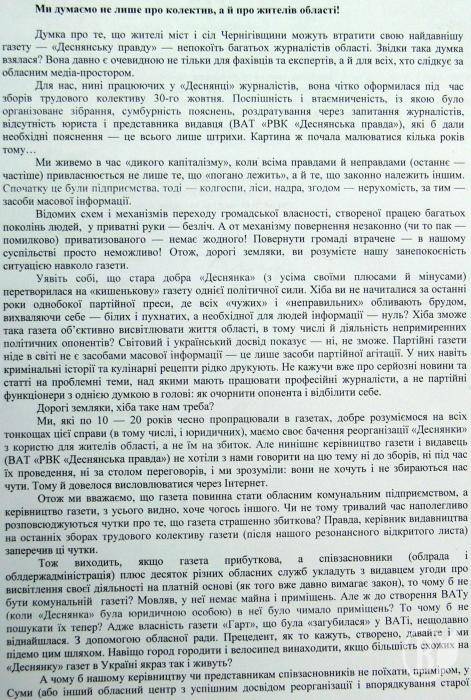 Ми, які по 10-20 років чесно пропрацювали в газетах, добре розуміємося на всіх тонкощах цієї справи (в тому числі, і юридичних), маємо своє бачення реорганізації «Деснянки» з користю для жителів області, а не їм на збиток. Але нинішнє керівництво газети і видавець (ВАТ «РВК «Деснянська правда») не хотіли з нами говорити на цю тему ні до зборів, ні під час їх проведення, ні за столом переговорів, і ми зрозуміли: вони не хочуть і не збираються нас чути. Тому й довелося висловлюватися через Інтернет.