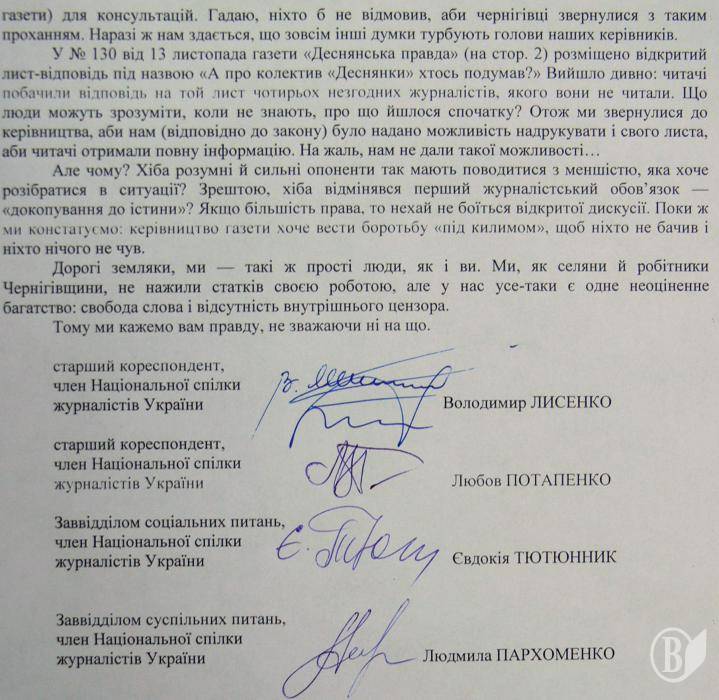 У № 130 від 13 листопада газети «Деснянська правда» (на стор. 2) розміщено відкритий лист-відповідь під назвою «А про колектив «Деснянки» хтось подумав?» Вийшло дивно: читачі побачили відповідь на той лист чотирьох незгодних журналістів, якого вони не читали.