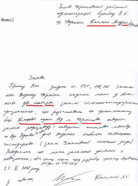 Отримавши відповідь, що дані ділянки в 2005 році передані на праві постійного користування дочірньому підприємству «Чернігіврайагролісгосп», Кислий А. написав чергову заяву (фото 2) на отримання у власність 2 гектарів землі поблизу Кільцевої траси (безпосередньо біля земель радіозаводу, навпроти житлового масиву по вул. Білова-Пухова).