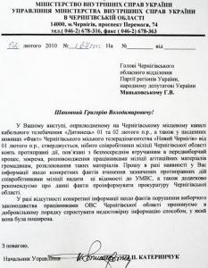 Состоянием на 2 февраля, согласно официальному ответу прокуратуры Черниговской области на запрос УМВД (фото 2) материалов, запросов или обращений граждан касательно противоправних действий милиции Черниговщины, связанных с непосредственным вмешательством в предвыборный процесс, не поступало.