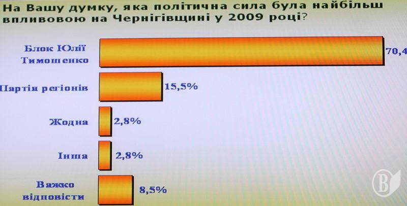 Лидером среди политических деятелей, которые формируют общественное мнение в Черниговской области, респонденты назвали Юлию Тимошенко. Значительно выросло влияние Виктора Януковича при большом падении доверия к Виктору Ющенко.