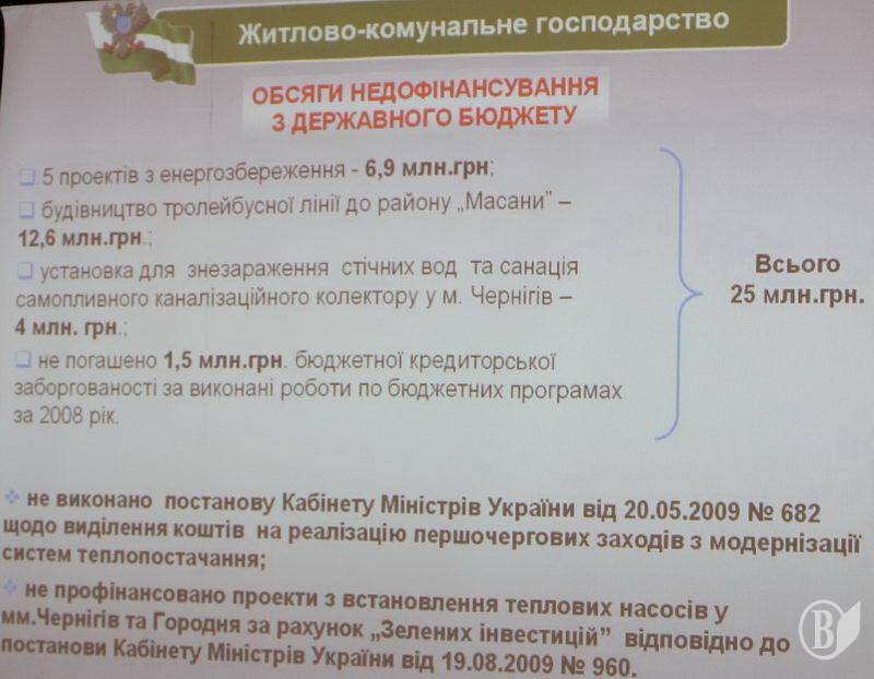 По убеждению главы облгосадминистрации Владимира Хоменко, значительному негативному влиянию, на развитие Черниговщины в прошлом году малая несогласованность в деятельности разных ветвей власти как на государственном, так и на местном уровнях. С целью создания условий для макроэкономической стабилизации и постепенного возобновления экономического роста хозяйственного комплекса области, улучшения жизненного уровня населения, определены основные задания на 2010 год.