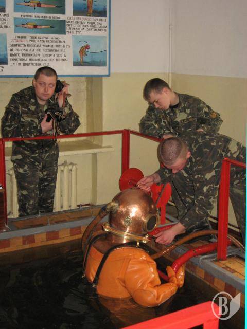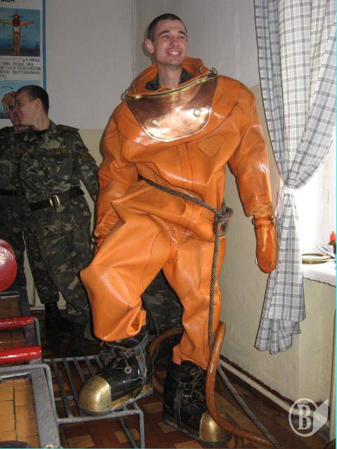 Дійсно, характер, темперамент і насамперед відмінне здоров’я людини є основними критеріями відбору на водолаза. У центрі їх вчать працювати в різних спорядженнях. Вага найважчого становить 80 кілограмів. Сюди входять шолом – 30 кілограмів, боти – 21 кілограм, та грузи, які чіпляють на спину і груди – по 16 кілограмів кожен.