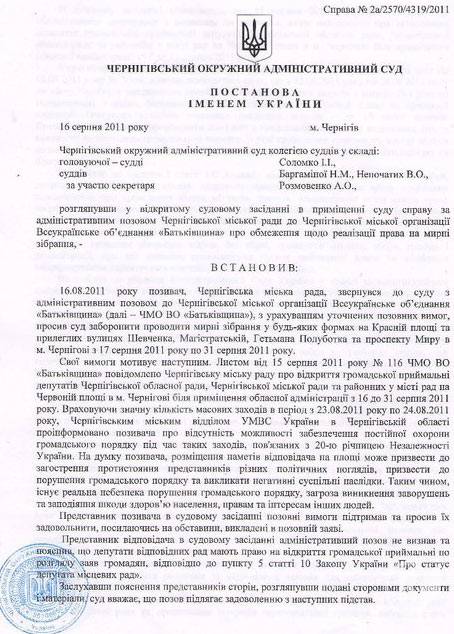 До вашої уваги рішення суду з проводу заборони розміщення наметів-приймалень депутатів у Чернігові, ухвалене сьогодні вночі. Воно уже розміщене в мережі Фейсбук.