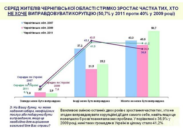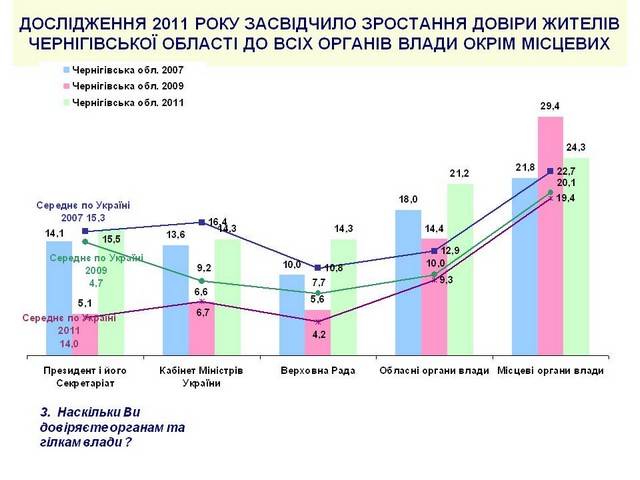 • Серед жителів Чернігівської області у 2011 році було зафіксовано зростання рівня довіри до Президента, Кабінету Міністрів, Верховної Ради - при одночасному зниженні рівня довіри до місцевих органів влади. При цьому у 2011 році в області значно зросла частка тих, хто не бажає виправдовувати корупцію.