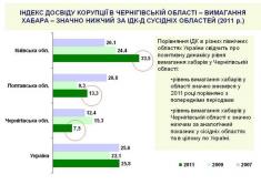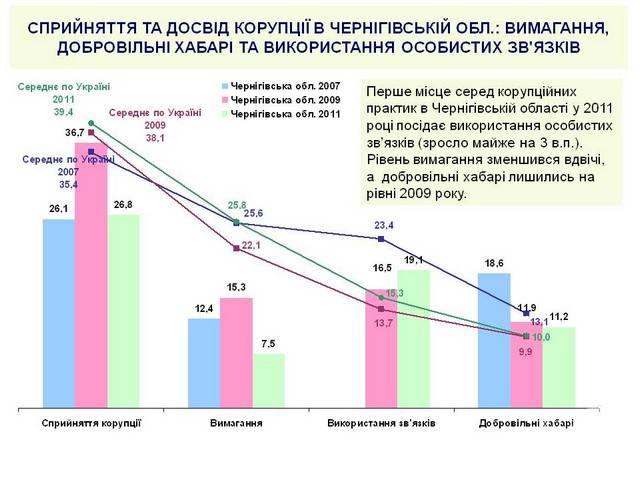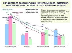 • Індекс досвіду корупції (вимагання хабара) у Чернігівській області є значно нижчим за аналогічний показник в цілому по Україні. У той же час, жителі Чернігівської області більш активно, ніж в цілому по Україні, використовують особисті зв'язки та пропонують хабарі добровільно.