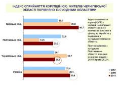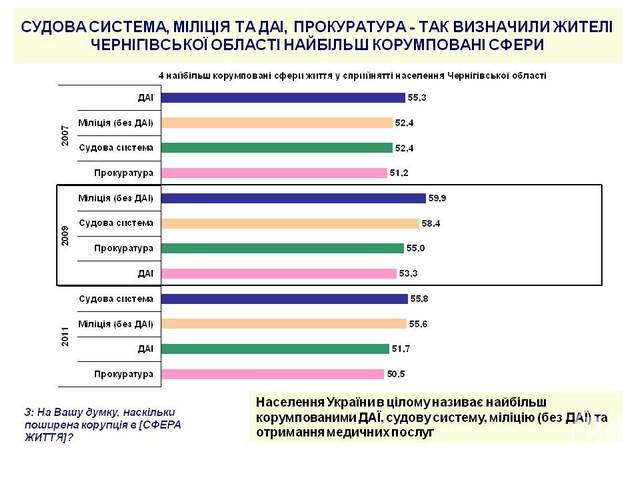 За результатами дослідження по Чернігівській області у 2011 році з корупцією в судах стикались 55,8% опитаних жителів Чернігівщини, в міліції – 55,6%, в ДАІ – 51,7%, в прокуратурі – 50,5%.