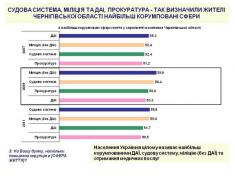 • Найбільш корумпованими сферами життя жителі Чернігівської області вважають судову систему, міліцію, ДАІ та прокуратуру. Ці сфери лишаються незмінно найбільш корумпованими, на думку респондентів області, вже протягом всіх опитувань.