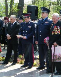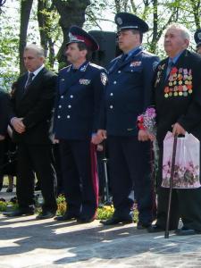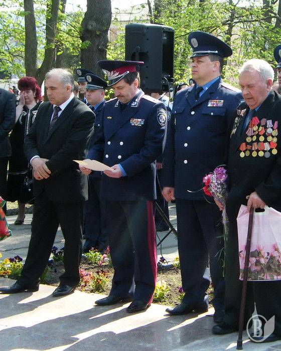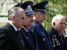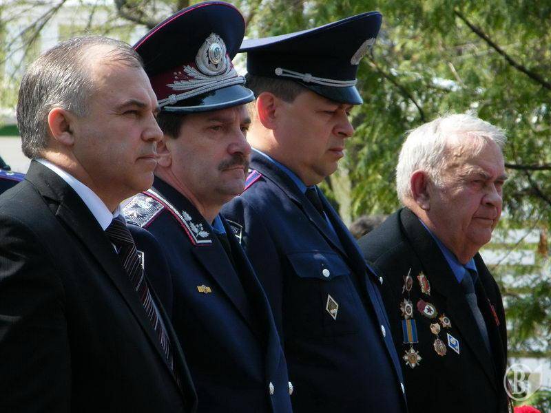 На фото зліва направо: ніжинський міський голова Михайло ПРИХОДЬКО, заступник Міністра внутрішніх справ України Леонід ЗИМА, начальник УМВС України в Чернігівській області Олександр МИХАЙЛИК, ветеран Великої Вітчизняної війни, пенсіонер МВС Петро КРОПИВ’ЯНСЬКИЙ. (Фото: Сергій СТУК)