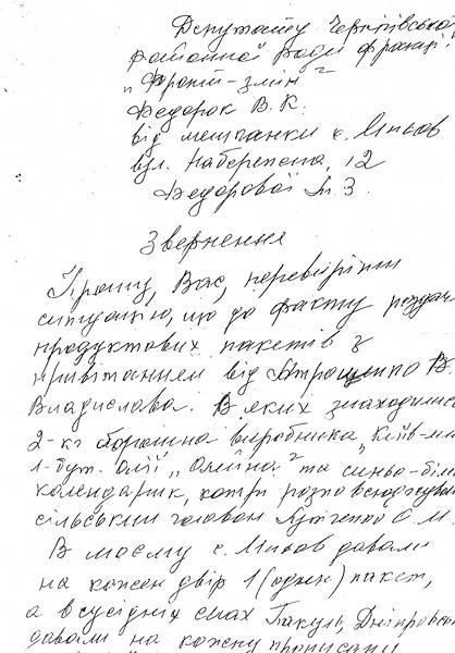 У відповідь Олена Михайлівна розповіла, що не всі категорії громадян отримують продукти, а лише ті, які були названі соціальним територіальним центром Чернігівського району. Із документів щодо походження цих продуктів та їх якості в неї є тільки «накладна», сертифікати ж якості відсутні.