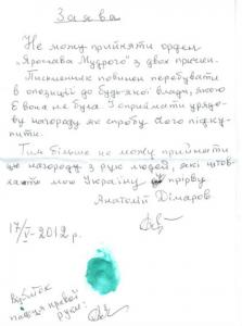 Анатолій Дімаров відмовився від ордена "Ярослава Мудрого"