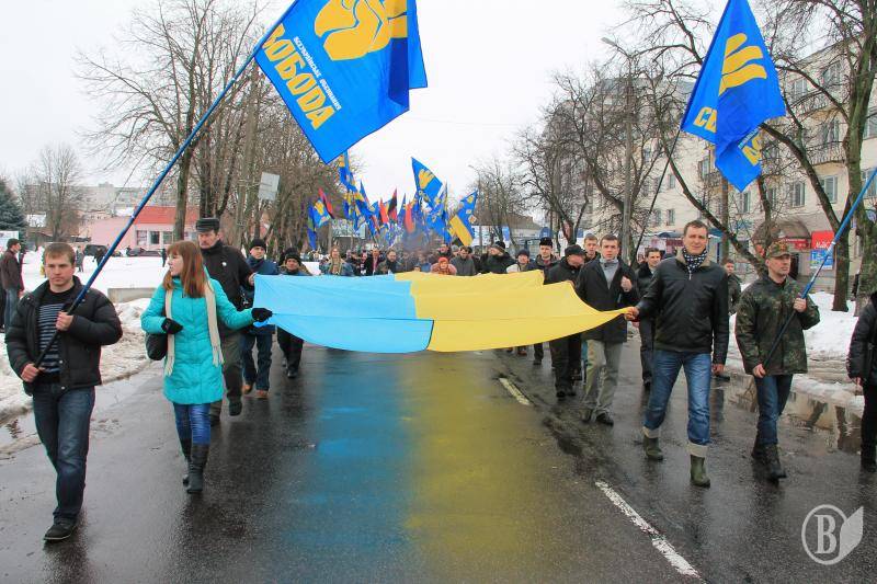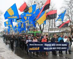Активісти несли плакати, на яких було написано заповіді з Декалогу українськго націоналіста, автором якого є Микола Міхновський. Очолили колону народні депутати-свободівці.