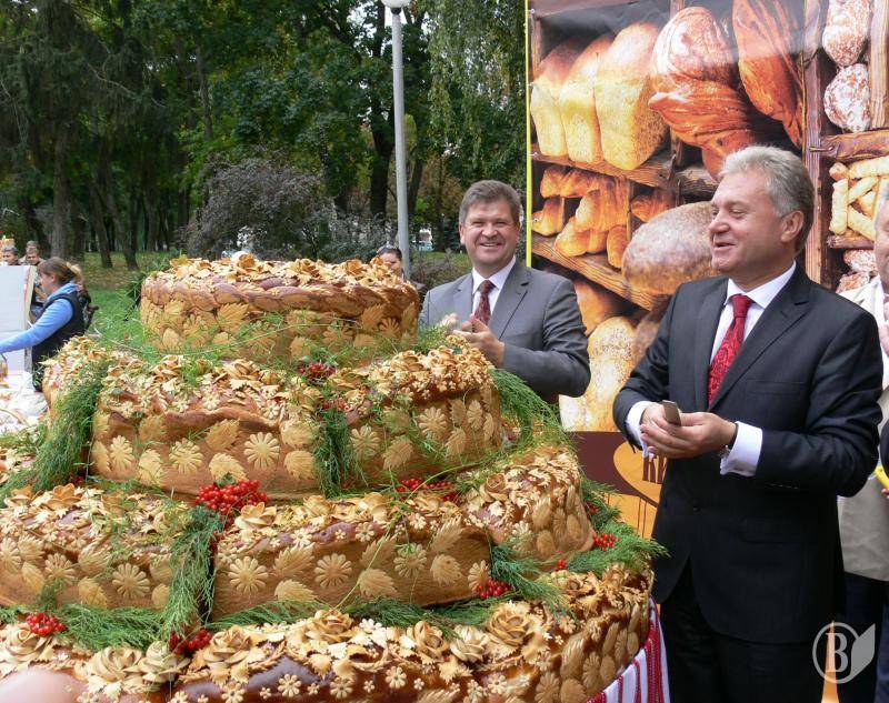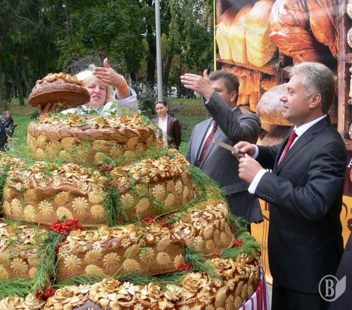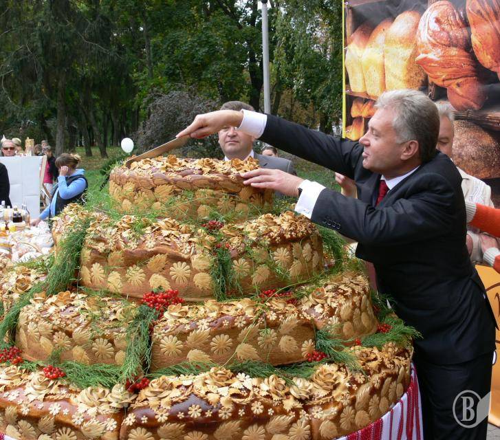 На фото: отакий коровай від «Київхліба» презентували на День міста – 2011 міський голова разом з головою наглядової ради «Хліба Києва» Владиславом Атрошенком