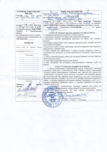 14 травня таку повістку про виклик як свідок отримав голова Чернігівської міської парторганізацій ВО «Батьківщина» Олег Русін. У документі йдеться про «зустріч» у відділі ЧМВ УМВС України в Чернігівській області задля участі у допиті у кримінальному провадженні.