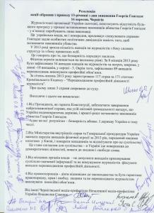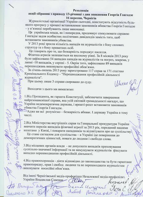 1. От Президента, как гаранта Конституции, обеспечить завершение самого резонансного дела, которое всей мировой сообществу напоминает, что Украина недемократическое государство, и в конце концов установить заказчиков убийства Георгия Гонгадзе.