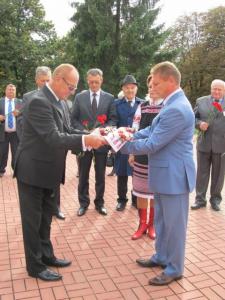 Делегації областей урочисто передали землю з могил, освячених кров’ю невинно убієнних жертв спалених сіл, для Меморіального комплексу пам’яті жителів населених пунктів України. Олексію Бакуті, директору Корюківського історичного музею, вручили для зберігання та передачі до Меморіалу торбинки з землею: від Житомирщини – Герман Бобильов, член делегації, учасник бойових дій, інвалід 1-ї групи, полковник у відставці, голова Богунської районної організації ветеранів у місті Житомир; від Сумщини – Віктор Забіяка, керівник делегації; від Полтавщини – Валерій Пархоменко, керівник делегації.